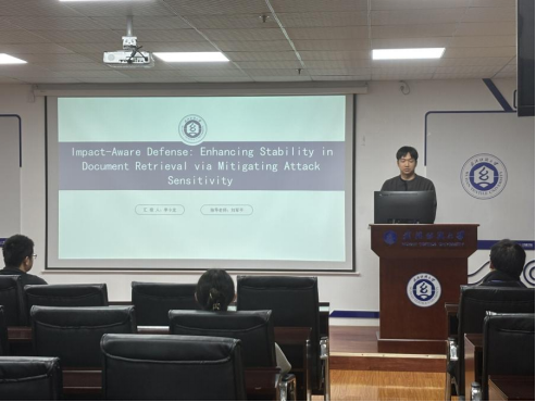 李小龍同學分享的主題為「Impact-Aware Defense: Enhancing Stability in Document Retrieval via Mitigating Attack Sensitivity」。近年來,得益於多種語言模型的迅速开展,文檔檢索領域取得了顯著進展。然而,當對抗性攻擊顺利获得對文檔內容進行細微擾動以操縱排序結果時,仍面臨關鍵挑戰。現有的防禦模型通常依賴於對抗攻擊的先驗知識或基於集成的魯棒性認證,從而限制了其實際應用。為彌補這一缺口,他提出了一種影響感知防禦算法(Impact-Aware Defense,IAD),該算法無需依賴先驗攻擊知識或集成推理,即可有效緩解排序操縱問題。IAD 的核心在於一種影響感知損失函數,它顯式地最小化模型對特定詞語的依賴,並顺利获得掩碼策略實現對擾動的不變性。更重要的是,理論分析證明了該方法的排序穩定性,有效約束了排名分數的波動。在三個廣泛使用的檢索基準數據集上的實驗結果表明,IAD 在對抗攻擊下顯著提升了模型的魯棒性。該方法實現了新的最新性能(state-of-the-art),在平均倒數排名(Mean Reciprocal Rank, MRR)上相較於此前最優結果取得了高達 29.4% 的相對提升。