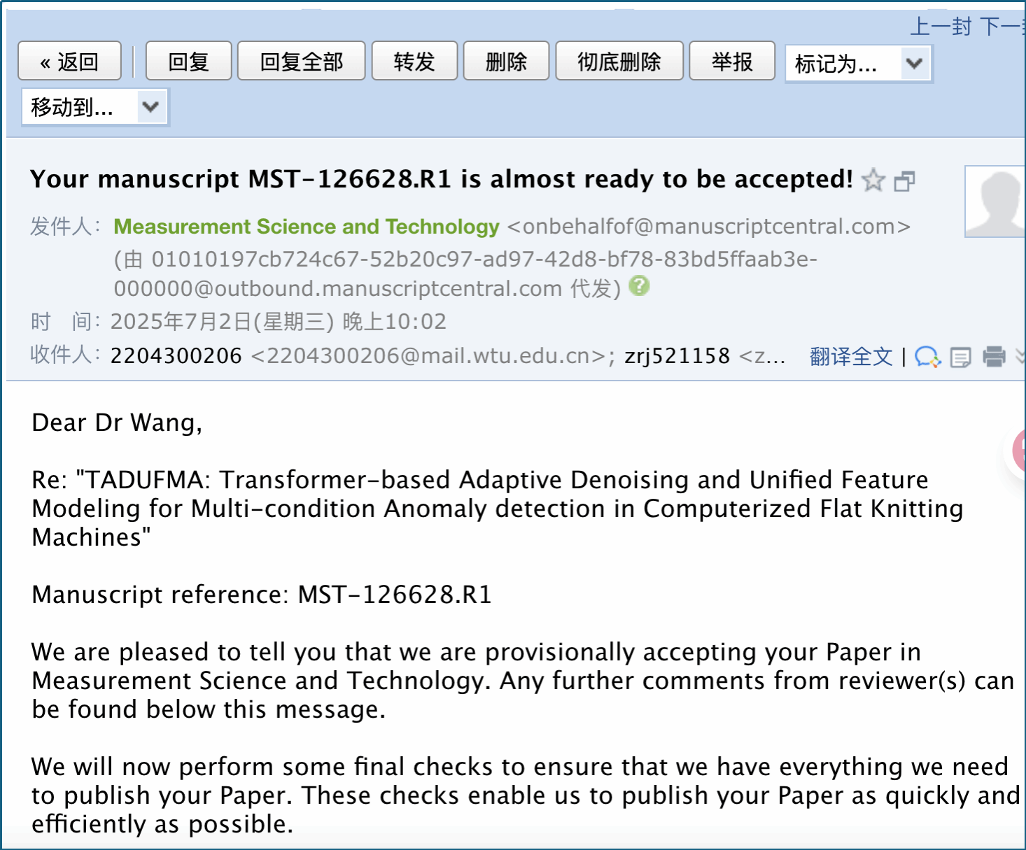 近期,k8凯发国际與人工智能學院人工智能專業本科生華潤凱、朱佳豪同學的科研論文(題目「TADUFMA: Transformer-based Adaptive Denoising and Unified Feature Modeling for Multi-condition Anomaly detection in Computerized Flat Knitting Machines」)被SCI期刊《Measurement Science and Technology》接收。我院王兆靜老師為論文的指導老師和通訊作者。