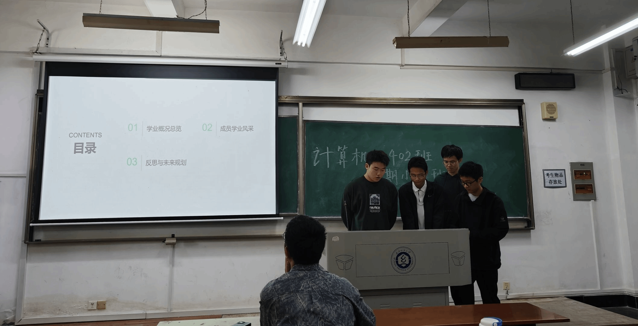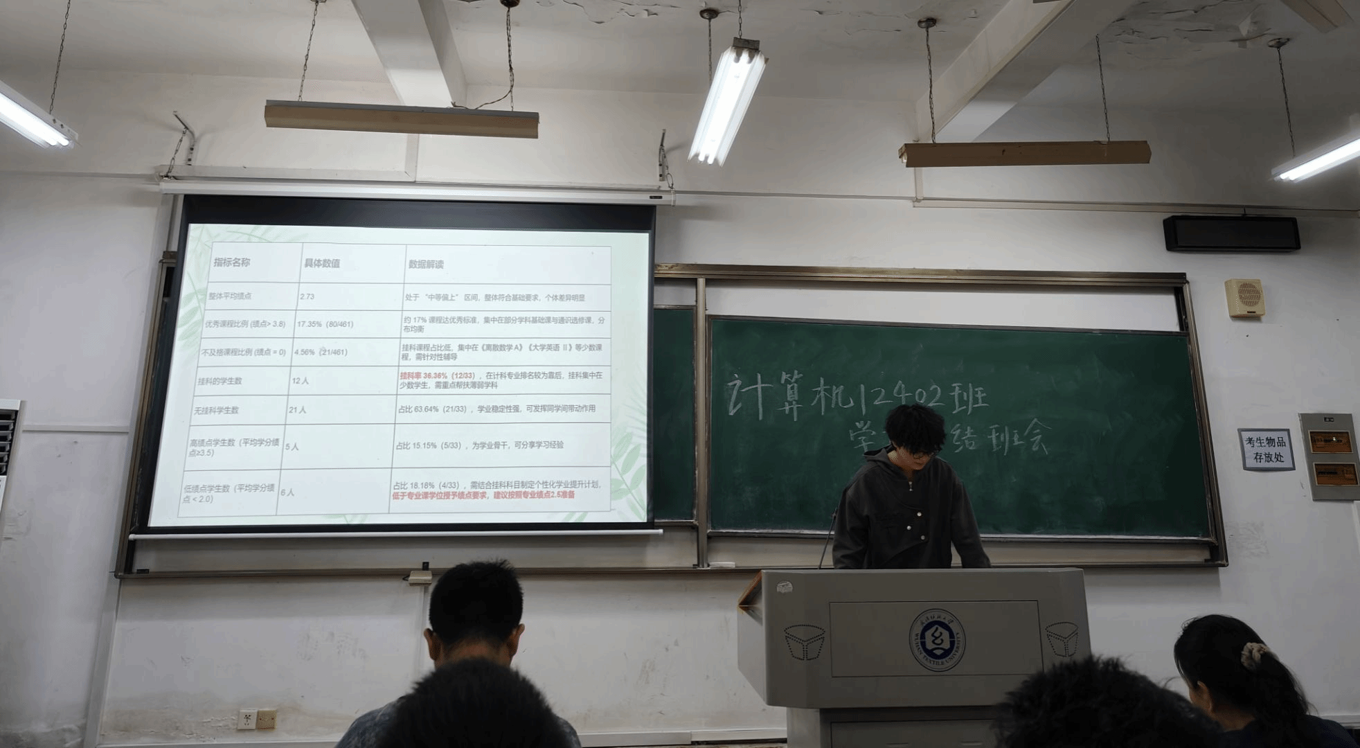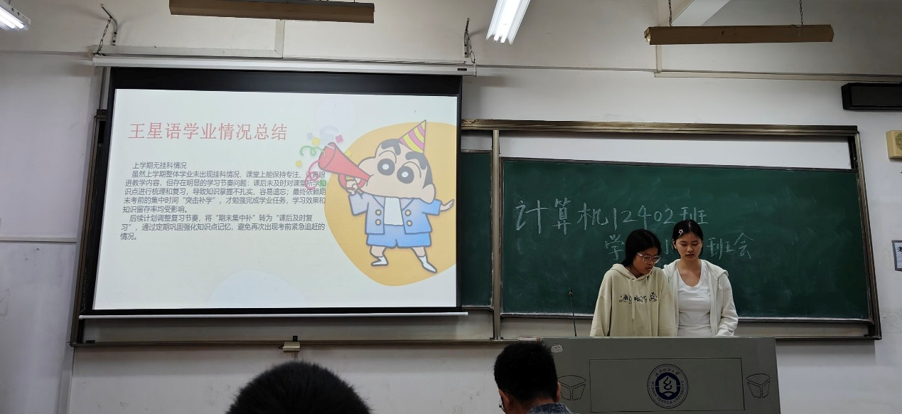 會議伊始,班長卻昌輝第一时间對班級整體學業情況進行全面復盤。他圍繞平均績點、掛科率、優秀學子表彰等核心數據展開分析,清晰梳理出班級的優勢學科與薄弱環節,為同學們精準定位提升方向。同時,他代表班委團隊公佈了新學期班級學習目標,明確了"補短板、強優勢、共進步"的开展思路。