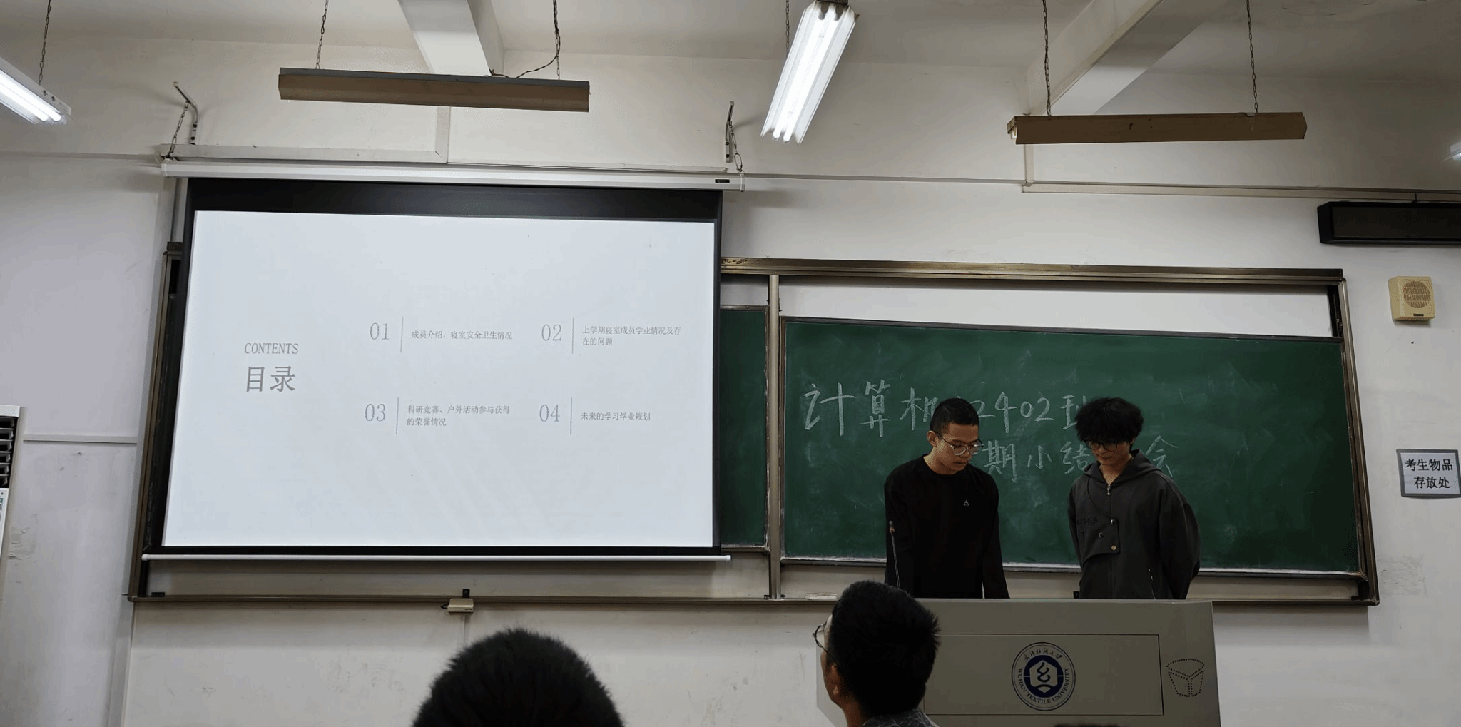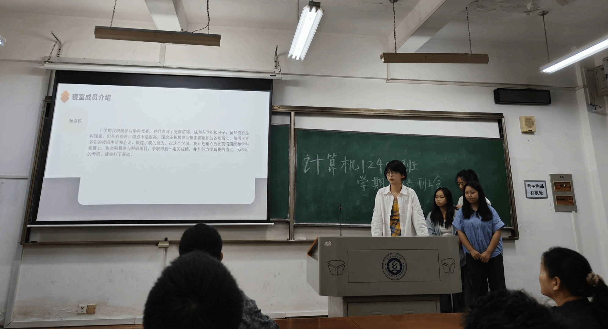 隨後,各宿舍匯報環節精彩上演。4B509宿舍成員依次回顧大一下學期的學習與社團經歷,劉亮、魏雲珅兩位同學深刻反思學習鬆懈問題,明確提出"課前預習、課後鞏固"的學習計劃,並細緻制定大二上學期任務清單。他們展示的宿舍照片乾淨整潔,成為男生宿舍內務與學風建設的典範。