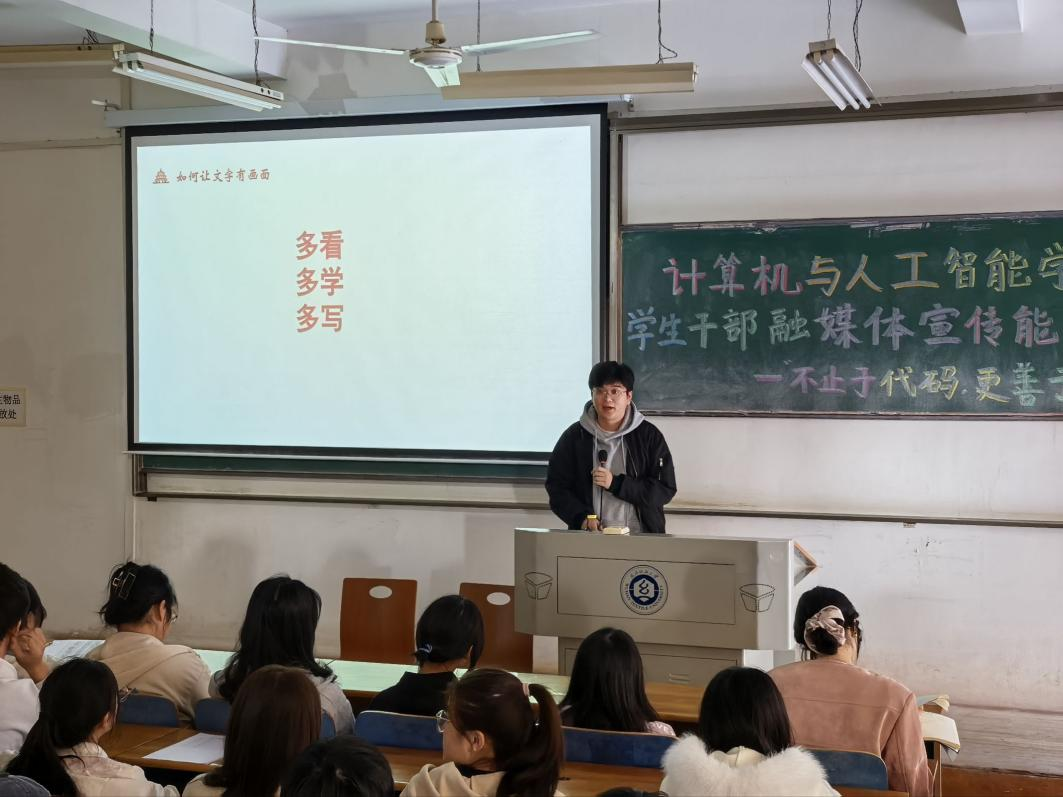 為提升學生幹部的媒體宣傳實操能力,助力學院宣傳工作提質增效,10月23日下午,k8凯发国际與人工智能學院於崇志樓216召开以「不止於代碼,更善於表達」為主題的融媒體宣傳能力專項培訓。院團委指導老師易凡、新媒體部門指導老師李港,輔導員張棟,2024級、2025級全體班委及學生會各部門學生幹部全員參與。培訓會由院團委副書記汪子涵同學主持。