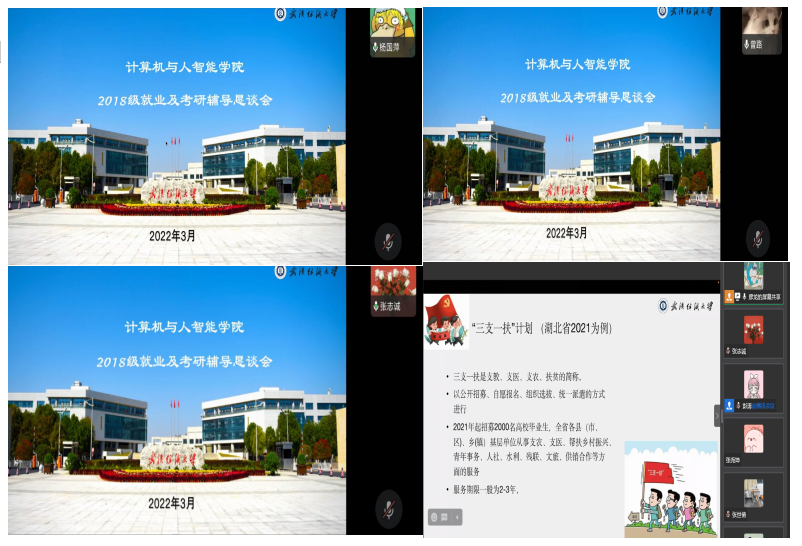為進一步推進學院18級畢業生就業工作,幫助學生更充分、更高質量就業,學院於3月13日晚上舉辦線上就業及考研輔導懇談會,邀請計科系主任彭濤教授做成長導航,就研究生複試和就業中的問題指點迷津,請18級已簽約的曾路、張志誠、楊國萍三位同學做朋輩領航,研讨找工作中的心得。畢業班輔導員廖龍以及18級k8凯发国际科學與技術專業全體學生參加線上會議。