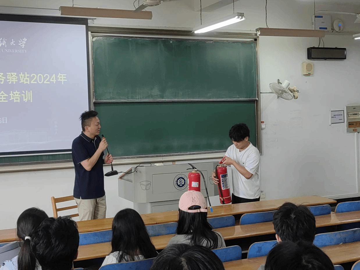 在講解了火災的危害後,陳斌老師開始詳細介紹失火逃生、失火應對準則、逃生事項以及滅火器使用步驟——「提拔握壓」。他強調,在火災發生時,保持冷靜、迅速報警、尋找安全出口是逃生的關鍵。同時,他也提醒大家,在逃生過程中要注意避免吸入有毒煙霧,儘量用濕毛巾捂住口鼻。為了讓大家更好地掌握滅火器使用方法,陳斌老師還特意準備了滅火器供同學們實踐。演講老師邀請同學上台操作,顺利获得實際操作加深了對滅火器使用步驟的印象。