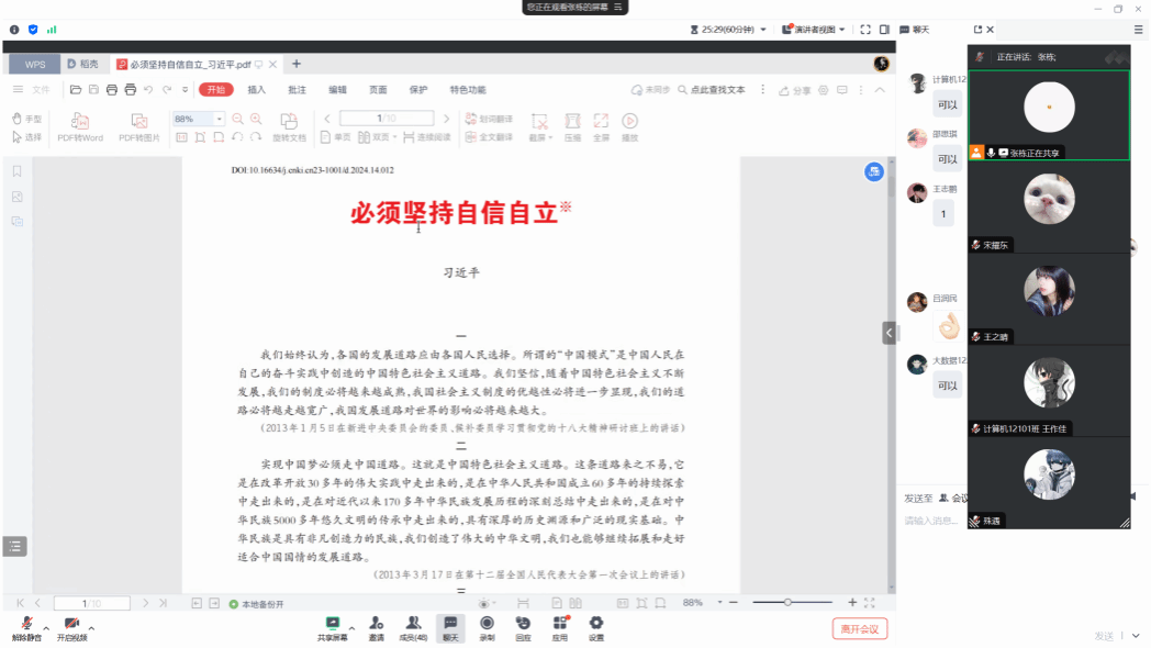 活動伊始,全體學生黨員在張棟同志的帶領下重溫了入黨誓詞。隨後,與會黨員集中學習了習近平總書記重要論述:《必須堅持自信自立》(原載《求是》2024年第14期),全體黨員充分認識到「四個自信」的重要意義,要把文化自信融入精神氣質與文化品格中,養成昂揚向上的風貌和理性平和的心態。