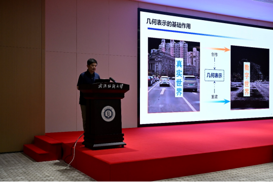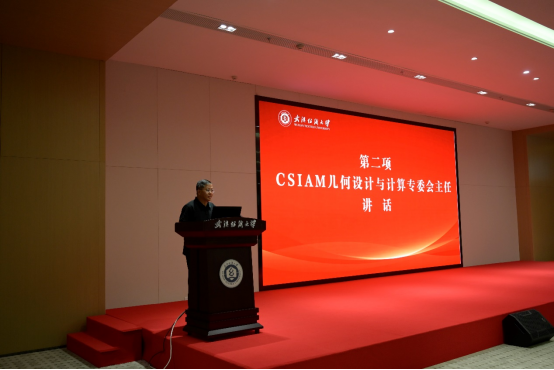 CSIAM 幾何設計與計算專委會主任中國科學技術大學劉利剛教授致辭,他第一时间感謝武漢紡織大學對此次活動的精心組織,並對專委會進行了介紹,希望顺利获得本次活動的舉辦,能夠增進與武漢紡織大學的研讨。