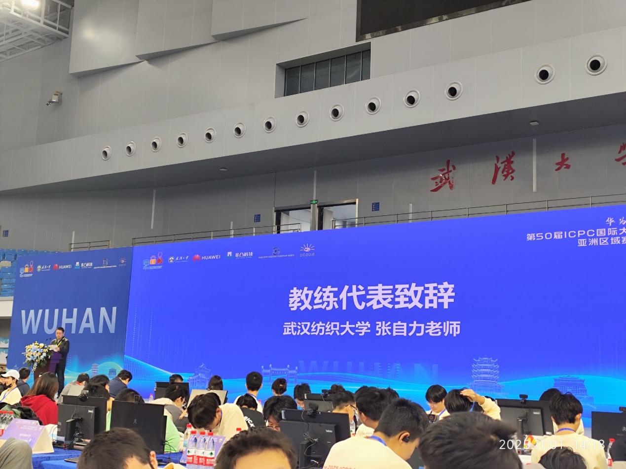 在發言中,張自力老師圍繞三個方面展開:第一时间,他代表全體教練向武漢大學表示衷心感謝,感謝學校精心組織這一高水平、高規格賽事,為全國青年學子搭建了切磋技藝、追逐夢想的舞台;其次,他指出ICPC不僅是算法與編程的競技,更是青春與智慧的碰撞,是團隊協作、臨場應變與堅韌精神的綜合體現。作為教練,他深知每一位選手都曾在無數個日夜與鍵盤為伴,與難題較勁,用一行行代碼編織邏輯,用一次次調試磨礪意志;最後,他回顧了武漢紡織大學ACM俱樂部的开展歷程,俱樂部自2020年创建以來,始終秉持「從零起步、迎難而上」的信念,不斷取得突破:2020年首獲銅牌,2022年收穫4枚銅牌,2024年實現銀牌零的突破,2025年在全國邀請賽中斬獲2枚銀牌,並在CCPC中國大學生程序設計競賽全國邀請賽(鄭州站)歷史性奪得2枚金牌。這些成績的背後,是隊員們無數個深夜的刻苦訓練、一次次從失敗中站起的堅持,也是一屆又一屆隊員用熱愛與執着不斷刷新的「武紡高度」。
