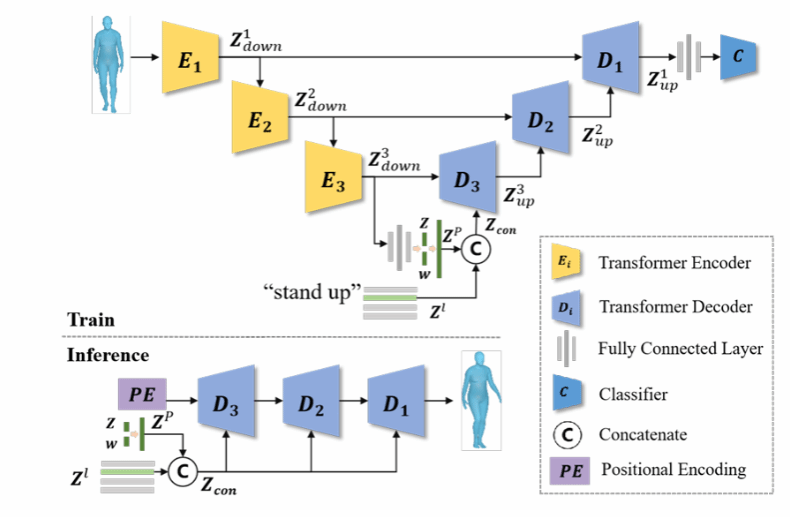 《Human Motion Generation Via Conditioned GMVAE With TUNet》由杜小勤副教授指導完成。論文提出了一種基於高斯混合模型和transformer U-Net(TUNet)的人體動作生成方法(CGMVAE-TU),該方法將隱空間建模為高斯混合分佈,並推導出新的變分下界(ELBO)。為了增強模型的表現力,增強各個子高斯分佈的區分度,使用費雪判別式(Fisher discriminant)作為正則化。最後,還提出了一種改進的注意力機制並應用於TUNet,僅利用動作標籤就能生成與語義信息相對應的動作。在各種數據集上對所提出的 CGMVAE-TU 模型進行了評估,幾乎所有指標上都超過了 SOTA,生成的人體動作逼真自然。