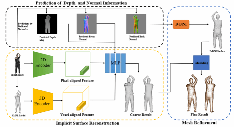 《PMDI: Combining Parametric-Model And Depth-Aware Implicit Function For Single-View Human Reconstruction》由鍾賽尚和胡新榮教授共同指導完成。論文針對现在三維人體重建存在的肢體動作異常,重建精度不高,背部細節缺失等問題,提出了一種結合參數化模型和深度感知的隱式重建算法,該方法能夠從單一RGB圖像重建出包含服裝的三維人體。第一时间顺利获得優化的參數化人體模型監督全局幾何特徵提取,並將改進的參數化模型,前視法線圖,深度先驗作為參數來訓練深度隱式函數。最終,我們將後視法線圖轉換為詳細但不完整的D-BiNI表面,以修復粗糙結果,從而有效地解決了上述問題。實驗結果表明,相較於傳統方法,該方法有效提升了重建結果的整體質量和表面細節。