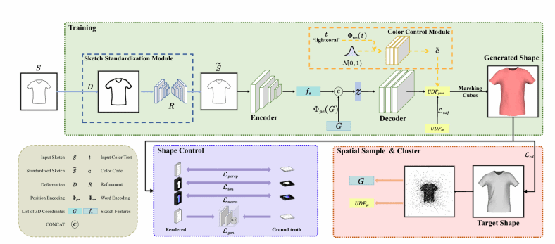 《SGM:A Dataset For 3D Garment Reconstruction From Single Hand-Drawn Sketch》由陳佳教授指導完成,論文提出了一個大規模的三維服裝模型數據集——SGM(Sketch-Garment Models), 包含了從36個不同視角渲染得到的5種類別服裝的渲染圖,包括草圖、輪廓圖、剪影圖、深度圖和法線圖。在SGM的基礎上,本文構建了一個端到端的重建網絡,該網絡能夠直接從輸入草圖生成能夠忠實表示輸入草圖形狀的高保真的服裝三維模型。最後,本文在SGM及現有的服裝三維模型數據集中進行了多樣性的評估,實驗結果表明,本文提出的重建方法在視覺效果和定量指標上均取得了最佳表現。
