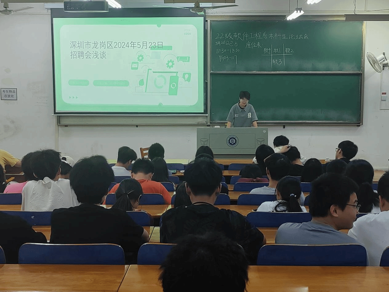 隨後,2022級軟件工程專業的代佳妙同學與同學們分享了她在深圳市龍崗招聘會上的經歷和感受。她第一时间介紹了幾家與我們相關專業相關的公司,包括他們的招聘要求和薪資待遇等情況。她指出,總體來說,本科生的薪資水平相對較低,而考研後的薪資待遇普遍較高。此外,她特彆強調了英語能力、口才和研讨能力以及綜合能力的重要性。最後,她為大家给予了一些新的思路,認為我們不一定非得從事程式設計師這個職業,還可以考慮公務員考試,或者選擇管理等其他職業道路。她以招聘會上的兩個培訓组织的招聘為例,鼓勵大家多方面關注就業信息,給自己更多的選擇機會。