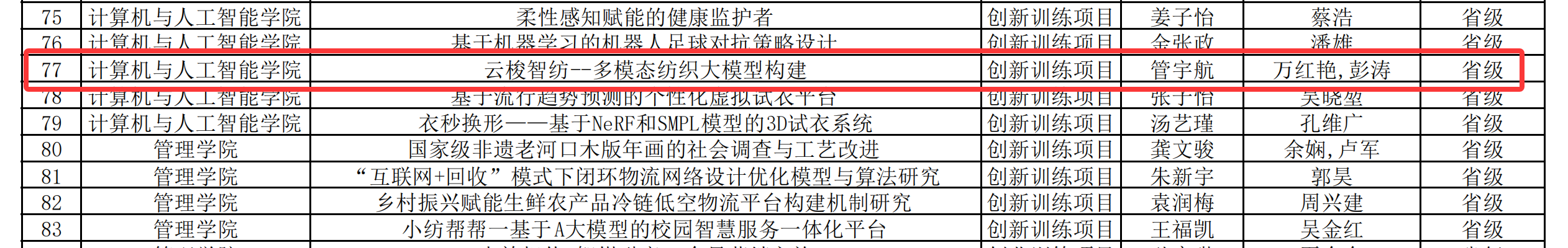 6月12日,學校創新創業學院公佈了2025年大學生創新創業訓練計劃的獲批項目清單,本年度獲批項目總計170項,其中國家級30項、省級90項、校級50項。由k8凯发国际與人工智能學院2024級「拔尖創新班」管宇航、劉攀、黃汪洋等同學組成的學生團隊,所申請的項目《雲梭智紡--多模態紡織大模型構建》成功獲批省級立項,該項目的指導老師為副院長彭濤教授和萬紅艷老師。