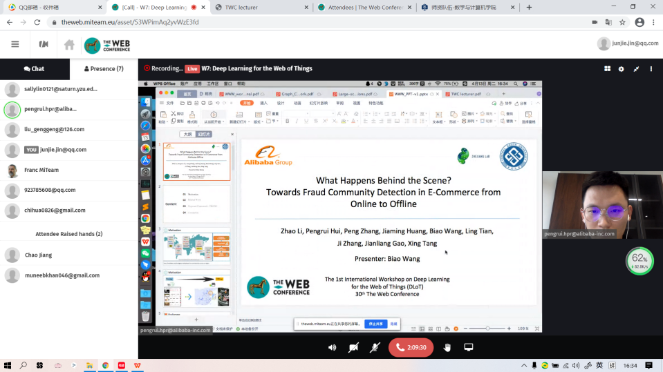 DASFAA2021會議於4月11日至4月13日在中國台北召開,WWW2021會議於4月19日至4月30日在斯洛文尼亞召開。鑒於當前國內外疫情形勢,會議均改為線上進行。論文的作者靳俊傑同學代表課題組分別對這兩篇論文進行了介紹並與參會者進行了詳細討論。