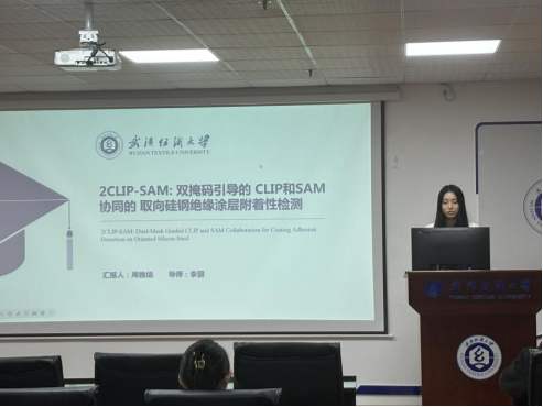 周雅烯同學分享的主題為「2CLIP-SAM: Dual-Mask Guided CLIP and SAM Collaboration for Coating Adhesion Detection on Oriented Silicon Steel」。取向矽鋼表面絕緣塗層的質量直接影響其磁性能穩定性與使用壽命。為提升檢測效率並降低成本,採用機器視覺替代人工檢測勢在必行,但傳統方法受限於少樣本和高光干擾。為此,她們提出一種基於CLIP與SAM協同的少樣本跨域異常檢測框架2CLIP-SAM。該框架引入多源跨域學習與域對抗訓練,構建雙CLIP定位網絡,實現對塗層脫落區域與反射高光區域的粗定位,顯著提升模型在少樣本條件下的泛化能力。進一步,設計雙掩碼高光抑制(MDS)機制以削弱光干擾,並藉助SAM模型實現脫落區域的精細化分割。依據GB/T 2522-2007標準召开的1000組測試表明,該方法檢測效果優於人工測量,為塗層附着性的自動化評估给予了可靠解決方案。