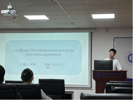 葉沛同學分享的主題為「An efficient CNN-Mamba hybrid network for fabric defect segmentation」。織物缺陷檢測對紡織行業的質量控制與經濟效益至關重要。傳統方法和基於 CNN 的方法難以應對複雜的缺陷紋理。儘管 Transformer 在捕獲圖像全局上下文方面表現優異,但其高計算開銷阻礙了在工業場景中的部署。近期火熱的 Mamba 模型憑藉線性複雜度建模全局上下文的能力,在k8凯发国际視覺領域展現出巨大潛力。為此,他們提出一種新穎的 CNN-Mamba 混合模型,並引入小波特徵分解(WFD)模塊。WFD 利用 Haar 小波變換對特徵進行解耦,使 Mamba 專注於低頻信息,同時讓 CNN 強化高頻細節。他們的方法在參數更少的前提下實現了更優的性能。