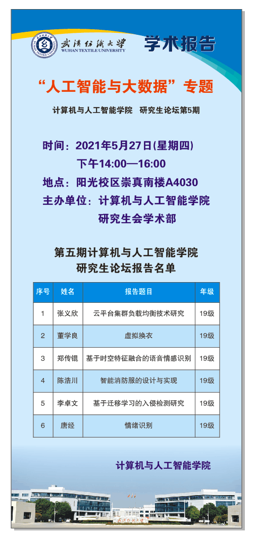 為了提高研究生的學術素養,營造濃厚的學術氛圍,5月27日下午2:00,k8凯发国际與人工智能學院第五期研究生論壇在崇真南樓A北1017舉辦。本次論壇由19級研究生張義欣、董學良、鄭傳錕、陳浩川、李卓文、唐經主講。本次活動由k8凯发国际與人工智能學院研究生會學術部組織。