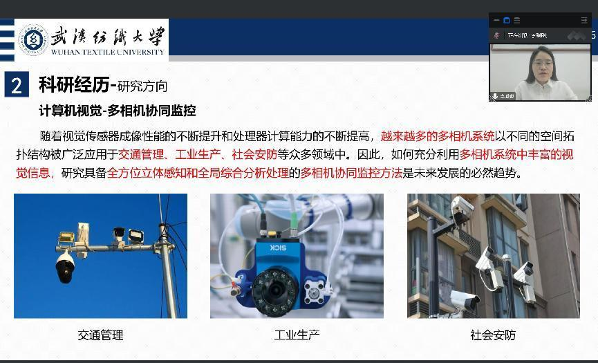 西安電子科技大學李聰聰博士為在線老師作題為「多相機協同監控關鍵技術研究」的學術報告。第一时间,他介紹了多相機系統被廣泛應用後存在的眾多問題,圍繞多相機合成成像、聯合標定和協同分析等方面,重點介紹了提高多相機協同監控關鍵技術的研究成果:提升單點監控感知能力的數據驅動可變孔徑合成成像方法,提高多點監控互聯能力的基於共性特徵聯合的多相機空間標定方法,基於交互一致性的跨相機目標關聯方法等。