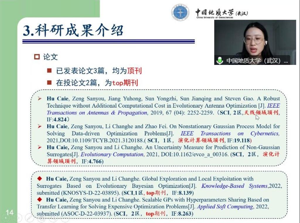 中國地質大學(武漢)呼彩娥博士作題為「基於模型協助的演化算法研究及其應用」的學術報告。天線是無線通信系統中重要的組件,被廣泛應用於廣播、點對點無線電通訊、雷達和太空探索等通訊系統,而天線設計問題通常是一類非線性、不可微、多峰值和電磁仿真耗時的優化問題,針對演化優化方法解決天線設計應用中的局限性,他提出了魯棒技術以實現魯棒演化天線,提出了非平穩高斯過程模型協助的演化算法以解決仿真耗時問題,提出了非高斯過程模型的不確定性衡量準則以解決現有機器學習模型中的不足。
