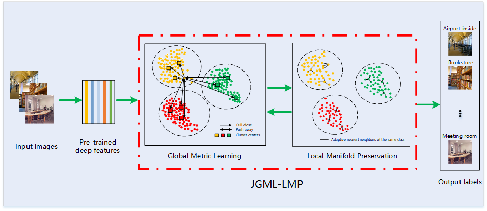 不同於一般目標圖像,場景圖像具有以下特性:類內高差異性,類間高相似性,光照不均勻,尺度多變性以及複雜的場景語義信息,這些給場景圖像識別帶來了巨大的挑戰。為了應對這些挑戰,基於預訓練深度特徵,第一时间,利用每個具體類的聚類中心設計一種新的全局度量學習方法,使得類內距離儘可能小而類間距離儘可能大,充分捕獲全局判別信息。其次,為了利用局部流形結構,在新的度量空間中引入了自適應最近鄰約束,以保持局部近鄰結構。最後,聯合全局度量學習和局部流形保持形成統一的學習框架(如下圖),在場景圖像數據集上的大量實驗證明了所提出的算法提升了深度特徵潛在的判別性和表達性,進而有效改善複雜場景圖像識別性能。