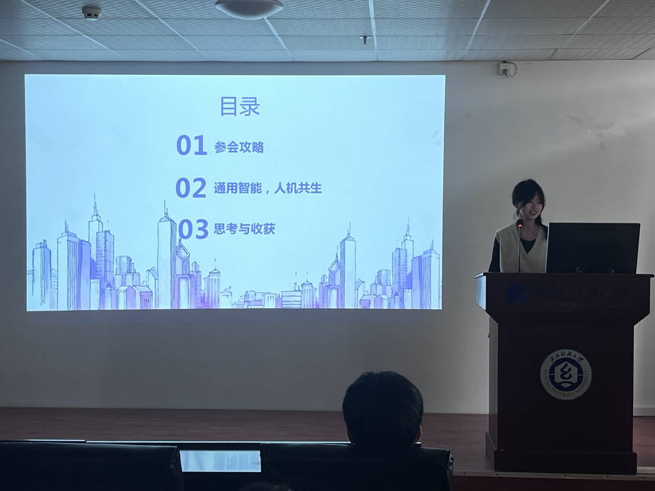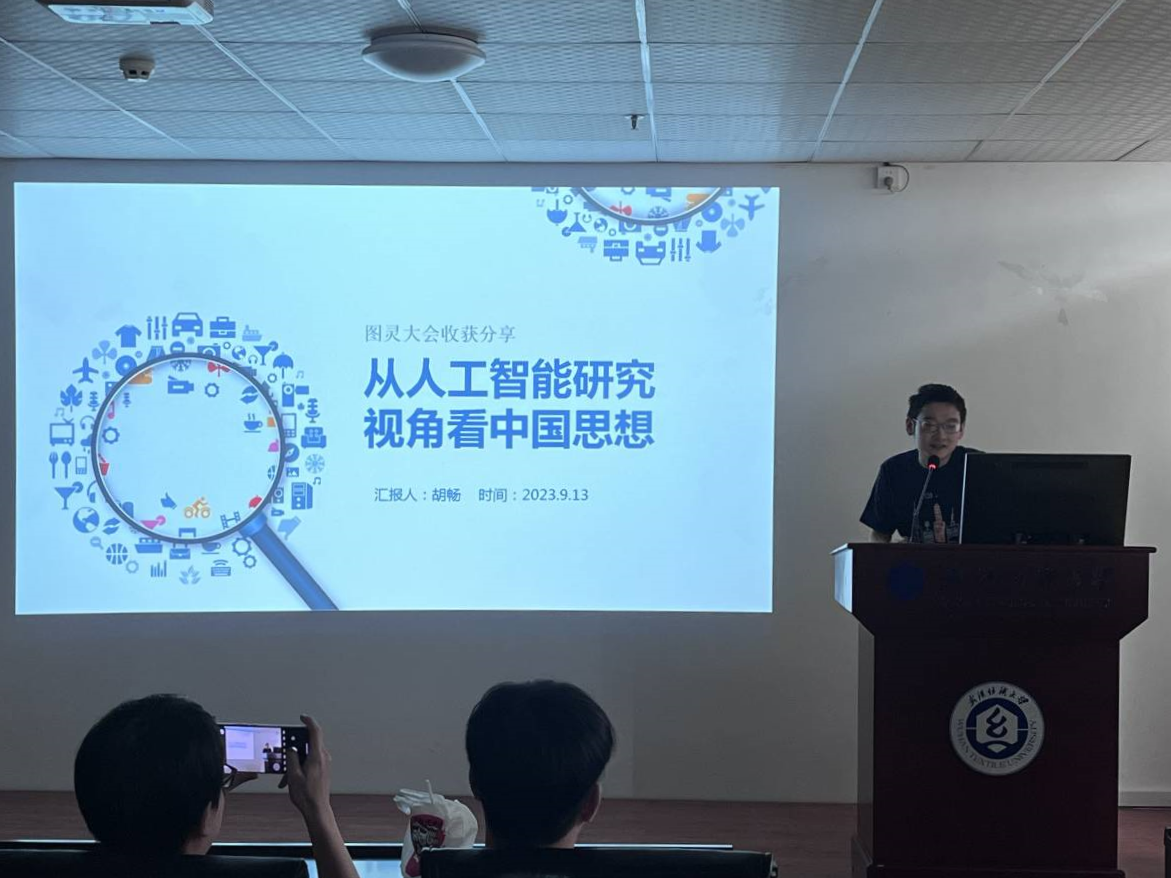 胡暢同學分享了朱松純教授在圖靈大會的講座題目:"為人文賦理,從人工智能研究視角看中國思想"。從物體到智能體、人類文明和人機共生的演進歷程中,都使用勢能函數U來建模。重要的質變是出現了具備自我意志和價值驅動的智能體,形成結構化的認知空間,產生各種複雜的社會結構,由價值函數V來建模。朱教授分析了儒學的主線,包括仁義、王道、理學和心學,這些思想將指導人工智能的开展,以通用人工智能助力中國式現代化建設。