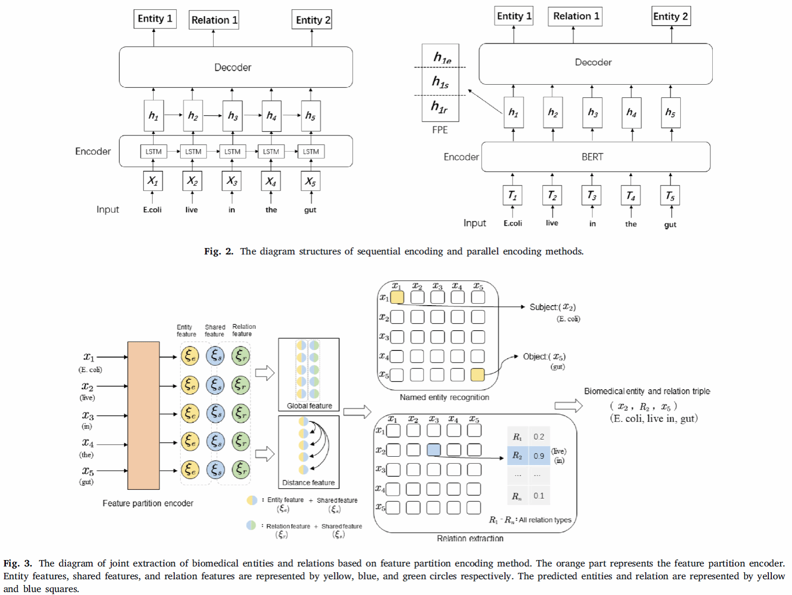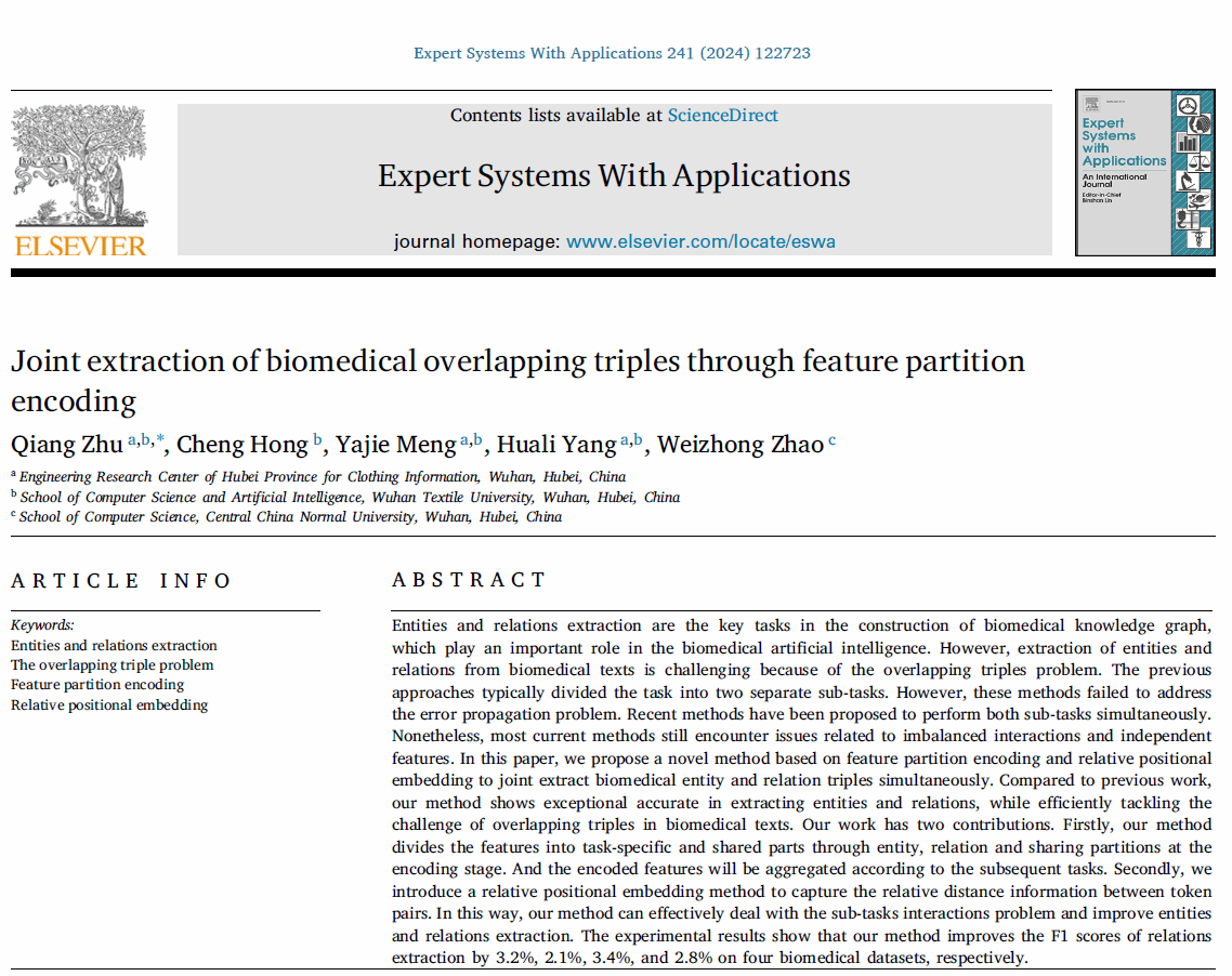 工作一:Joint extraction of biomedical overlapping triples through feature partition encoding發表在期刊《Expert Systems with Applications》。該研究工作提出了一種基於特徵分區的實體-關係三元組抽取模型,以解決複雜醫學文本的實體重疊難題,從而為信息抽取和構建高質量知識圖譜给予了一種可行的解決方案。