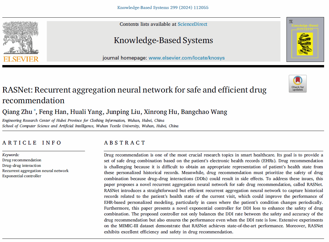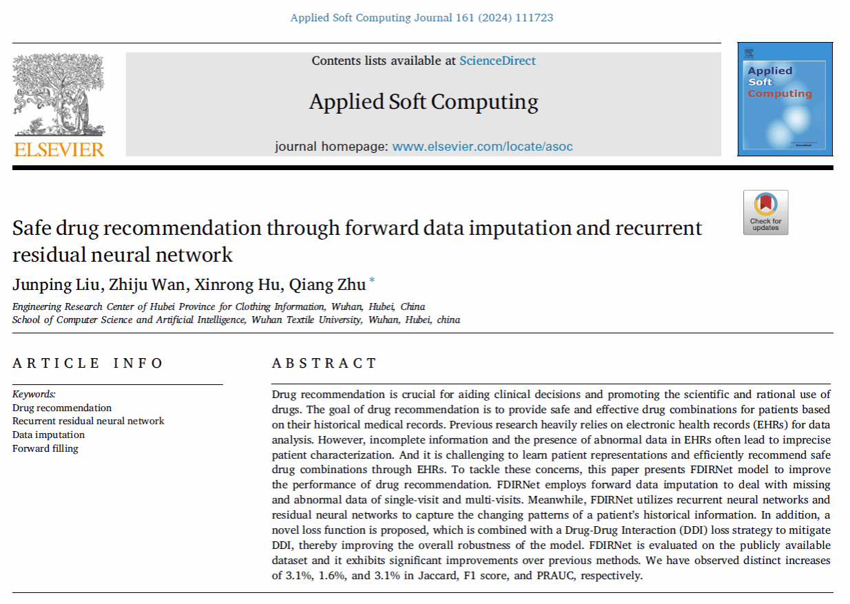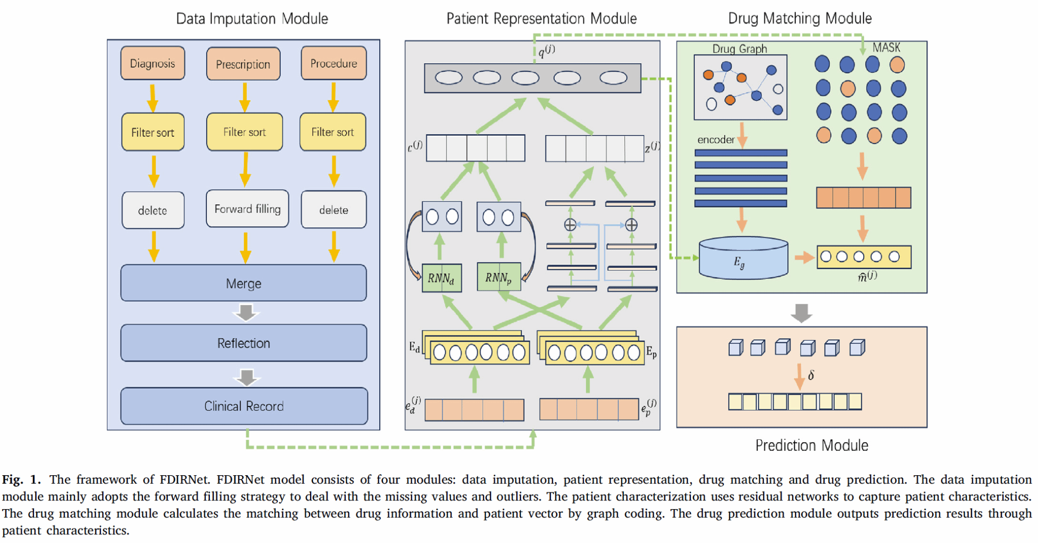 工作二:Safe drug recommendation through forward data imputation and recurrent residual neural network發表在期刊《Applied Soft Computing》。由於醫療文本廣泛存在數據缺失問題,使得患者的健康狀態畫像不準確,從而導致患者安全用藥存在隱患,該研究工作提出了一種前向數據填充方法,以顺利获得引入藥物-藥物相互作用領域知識圖譜確保推薦藥物組合的安全性。