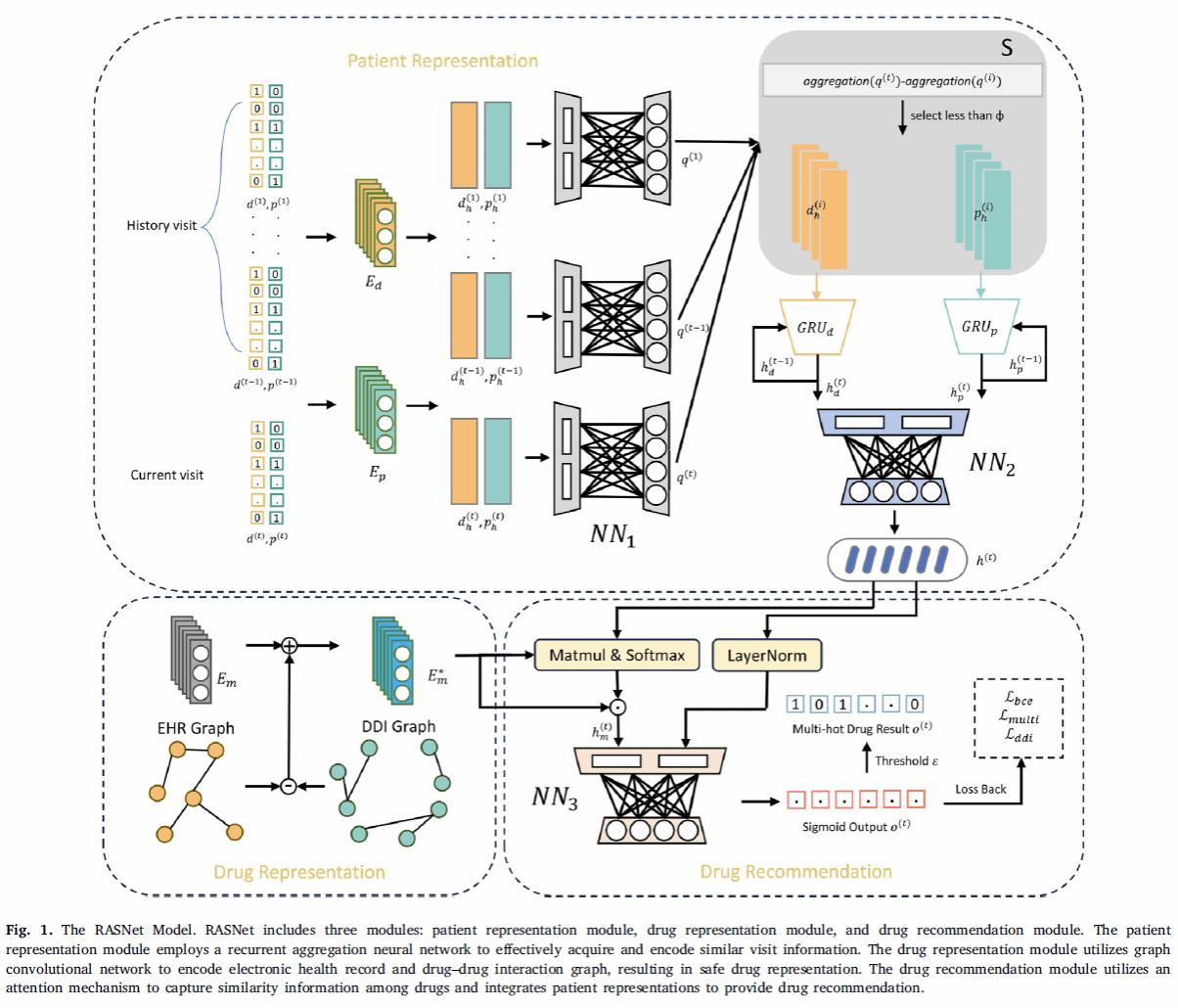 工作三:RASNet: Recurrent aggregation neural network for safe and efficient drug Recommendation發表在期刊《Knowledge-Based Systems》。長期慢性病患者的病情會出現反覆,如何基於電子病歷對此類患者建模以精準推薦用藥是一個難題。該研究提出了一種新穎的循環聚合神經網絡,可以有效解決因病情反覆引入的數據噪聲問題。此外,該研究提出了一種新型指數控制器可有效平衡藥物推薦的匹配精度和安全性。