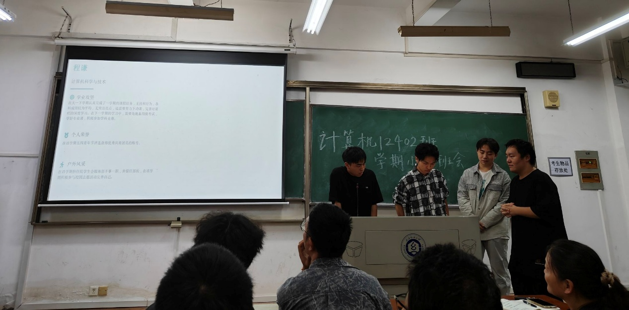 會議伊始,班長卻昌輝第一时间對班級整體學業情況進行全面復盤。他圍繞平均績點、掛科率、優秀學子表彰等核心數據展開分析,清晰梳理出班級的優勢學科與薄弱環節,為同學們精準定位提升方向。同時,他代表班委團隊公佈了新學期班級學習目標,明確了"補短板、強優勢、共進步"的开展思路。