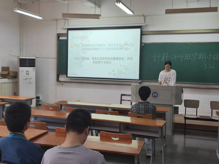 學習委員鐘點在寢室匯報結束後對班級整體學業情況進行介紹。上一學年班級學業整體穩定,班上同學互幫互助,「筆記共享」「課後答疑」等機制營造了良好氛圍,但也存在掛科現象,部分同學在四六級和編程學習上進度滯後。結合班主任余鋒提出的「自覺學習」要求,她明確了新學期計劃:整理共享重難點資料、每周匯總並協調答疑、定期提醒學習進度,希望全體同學以更自覺的態度夯實基礎、攻克難點,共同提升班級學業水平。