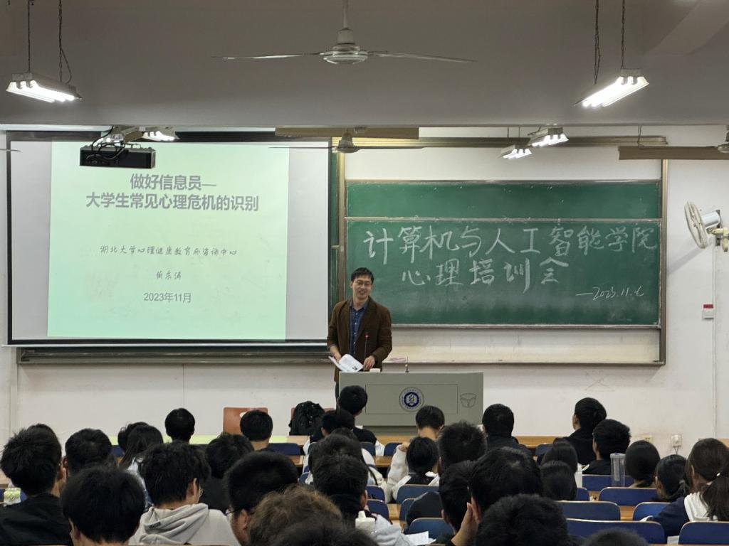 為了全面拓展心理健康教育工作的途徑,進一步提高各班心理委員的專業技能,充分發揮學生骨幹的作用,促進心理健康知識的廣泛宣傳,11月8日,k8凯发国际與人工智能學院在YG03-115教室召开「实行信息員-大學生常見心理危機的識別」主題培訓會。此次會議由2023級輔導員易凡主持,湖北大學心理健康中心黃東濤老師主講,輔導員陳禎,2023級學生、2022級心理委員參會。