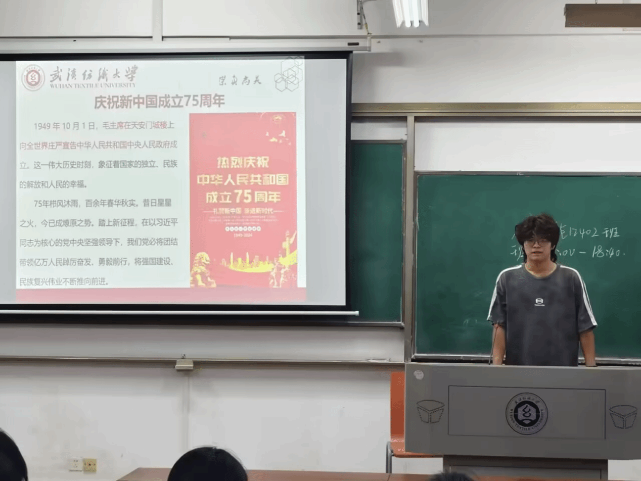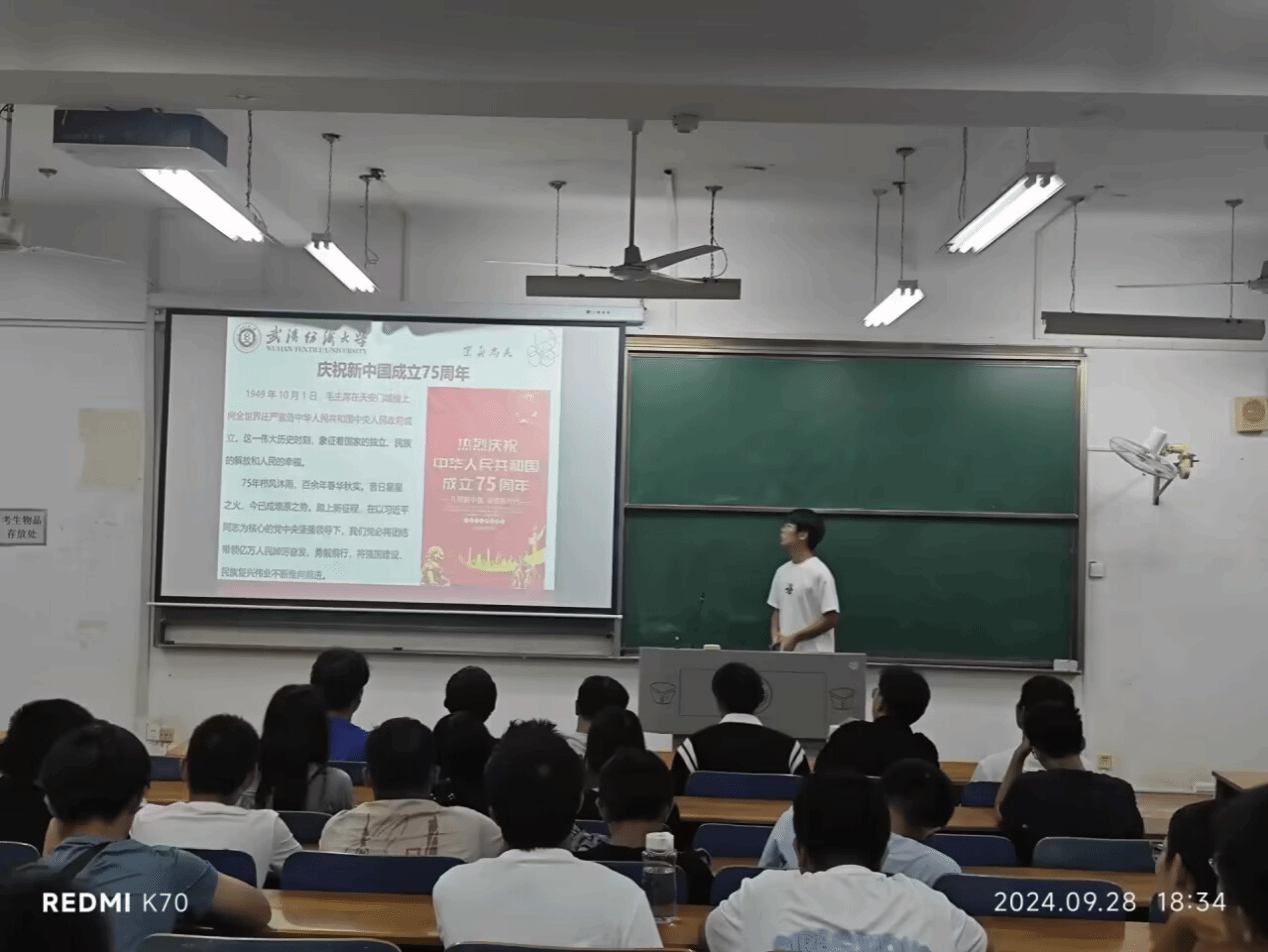 班會開始前,輔導員清點學生的參會情況,對未參會學生逐一排查確認,確保學生安全。班會上,班主任先介紹了國慶的由來,強調了國慶深刻的歷史意義,又以「七十五載長歌奮進,賡續前行再奏華章」為切入點,回顧了隨新中國创建七十五周年所發生的大事件,介紹了新中國开展的偉大成就,豐富了學生的知識積累,進一步激發了同學們的愛國熱情,引發進一步思考,反思新青年的开展責任。