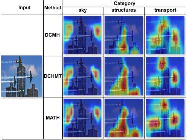 圖2.對比MATH、DCMH和DCHMT方法在不同真實類別下的GRAD-CAM可視化效果