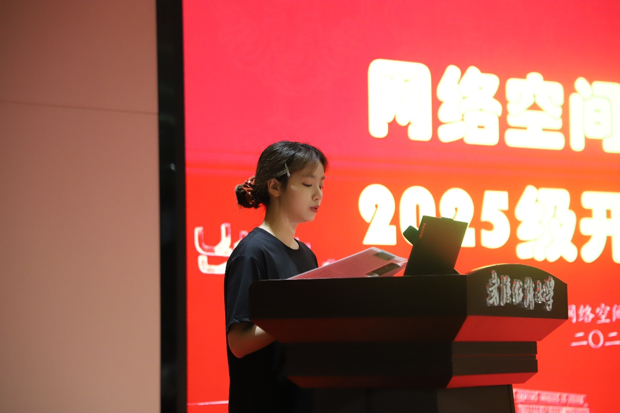 2025級網絡空間安全專業新生代表趙詩慧妍同學上台發言。她分享了自己在入學前的假期里,便主動提前分析專業知識、召开先導學習的經歷,表達了對即將開啟的大學生活的憧憬與刻苦求學的決心,展現了首屆網安新生的持续風貌與求知熱情。