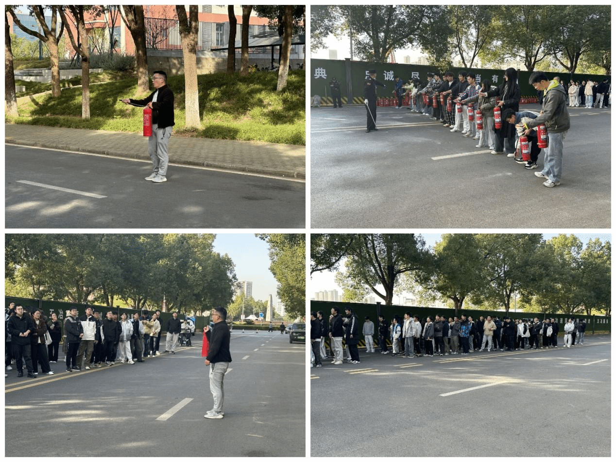 講座結束之後,在保衛處領導老師的指導下召开實操演練環節。第一时间,由專業人員講解滅火器的使用方法,並現場示範了滅火器「提、拔、握、壓」的正確操作步驟,再由同學們十六人一組分組進行實操練習。