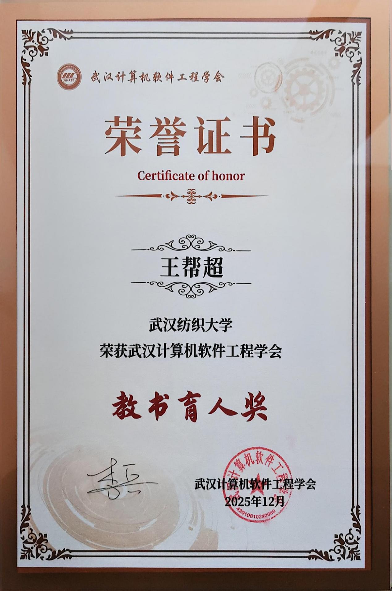 圖2 王幫超老師「教書育人獎」獲獎證書