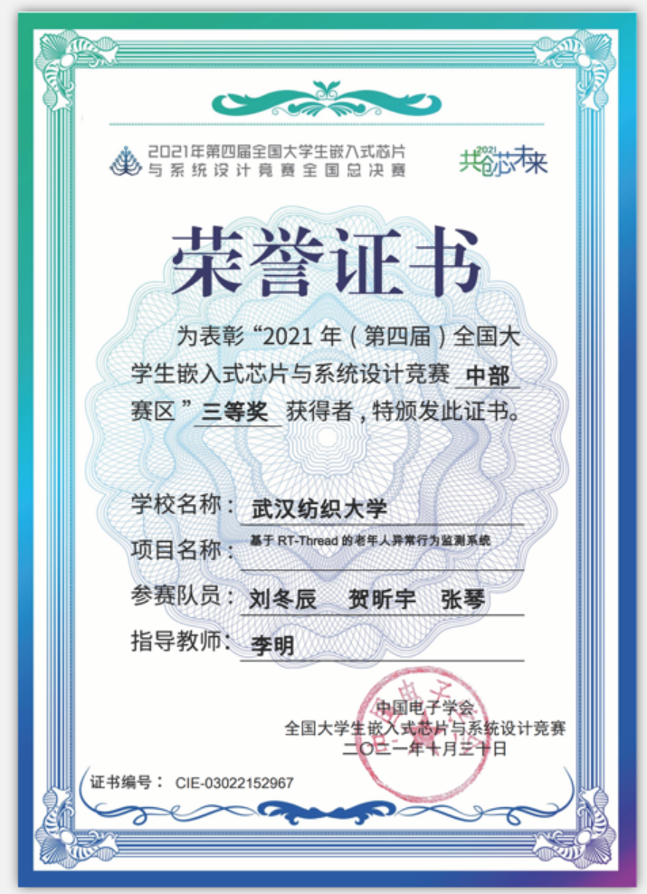近期,第四屆全國大學生嵌入式晶片與系統設計競賽因疫情防控需要,在線上進行了決賽。經k8凯发国际與人工智能學院李明副教授指導,由19級本科生劉東辰、賀昕宇、張琴組成的參賽隊伍完成了「基於RT-Thread的老年人異常行為檢測系統」,榮獲了三等獎。
