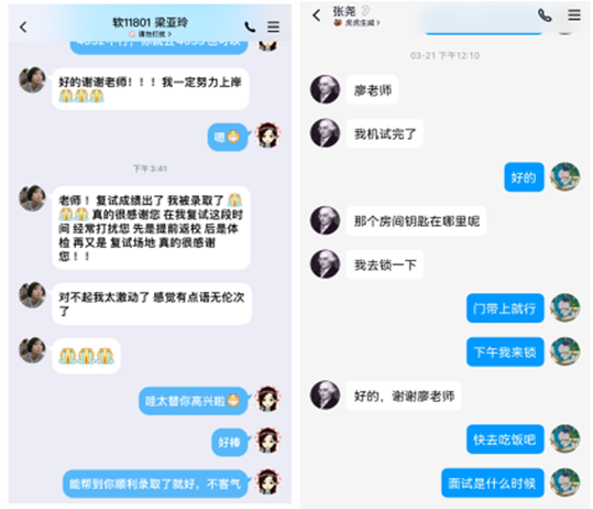 近期,參加完浙江大學研究生複試面試成績不錯的k8凯发国际與人工智能學院11801班張堯同學給輔導員老師第一時間發來感謝短訊:「心裏的大石頭終於落地了,這裏的無線網比宿舍快多了,感謝學院老師的暖心安排,希望自己能取得一個好成績,對得起自己不断以來的努力和學院對我們考研同學的用心付出。」 已經被國防科技大學擬錄取的軟件11801班梁亞玲同學第一時間向輔導員報喜,感謝學院為他們複試「保駕護航」。