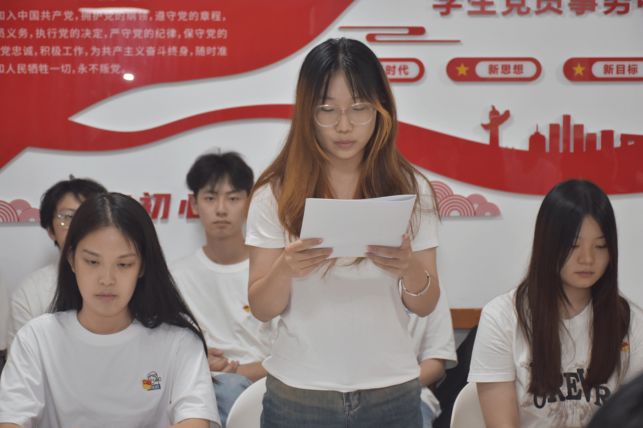 會上,張棟宣佈實際到場黨員人數。接着,开展對象逐個宣讀入黨志願書,其入黨介紹人介紹有關情況,並發表意見。經過現場具有表決權的正式黨員對兩名开展對象的充分討論,同意接收陳昊宇等30名同志為中共預備黨員。隨後,新开展預備黨員在黨旗下莊嚴宣誓。